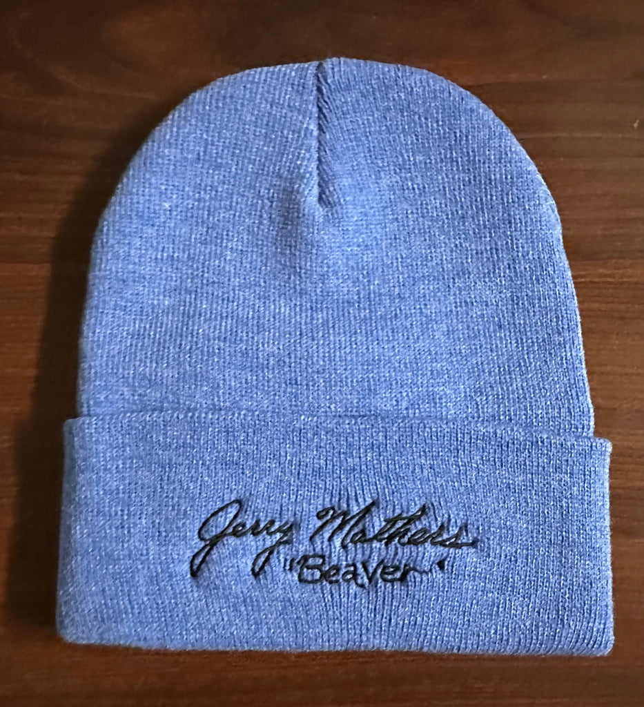 A warm, 100% acrylic knit cap with Jerry's embroidered signature!